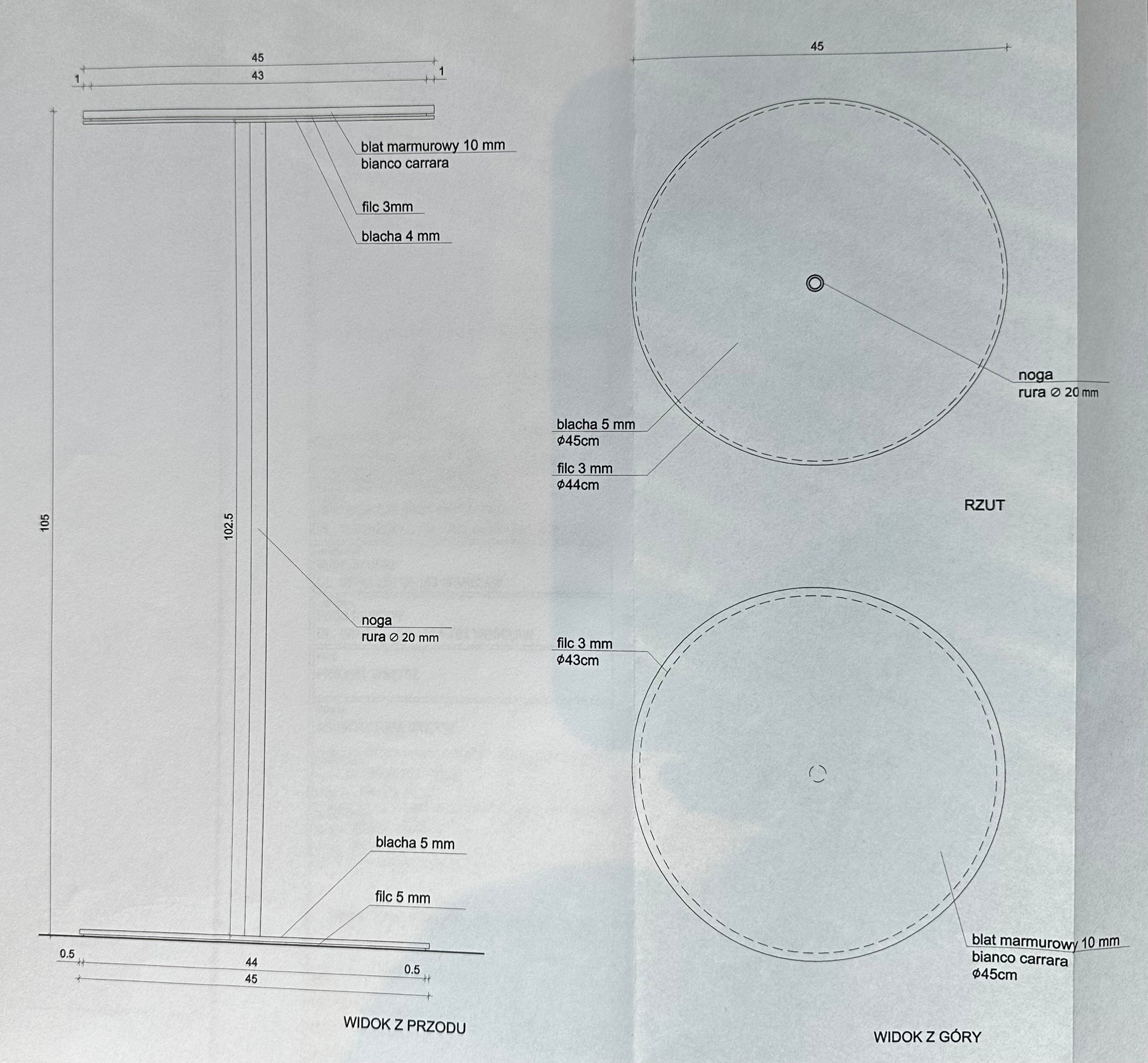 Wymiary: 45cm (średnica blatu) x 105cm (wysokość)